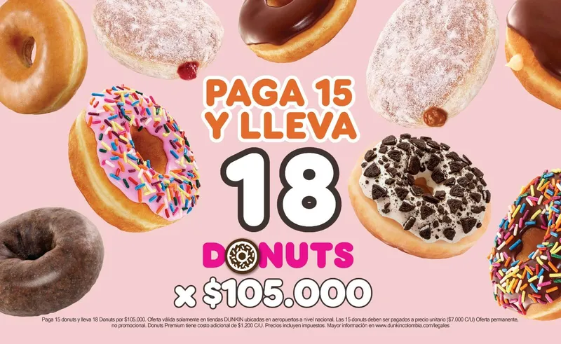 Paga 15 donuts y lleva 18 Donuts por $105.000. Oferta válida solamente en tiendas DUNKIN ubicadas en aeropuertos a nivel nacional. Las 15 donuts deben ser pagados a precio unitario ($7.000 C/U) Oferta permanente, no promocional. Donuts Premium tiene costo adicional de $1.200 C/U. Precios incluyen impuestos. Mayor información en www.dunkincolombia.com/legales