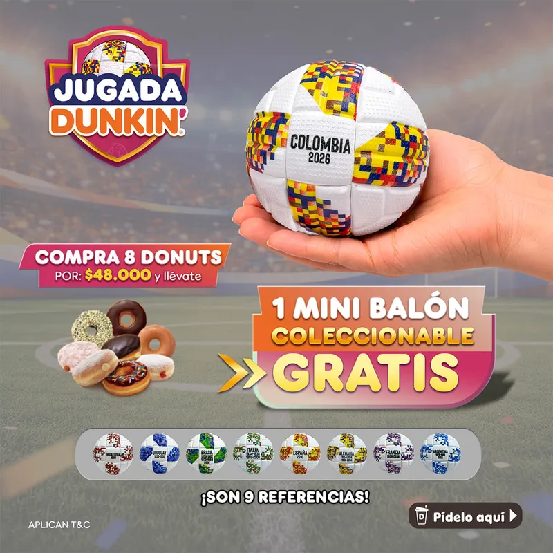 Promoción DUNKIN GOL: Lleva 8 donuts por $48.000 y recibe gratis un Balón DUNKIN. Aplican términos y condiciones: Válida a nivel nacional, del 6 de abril al 31 mayo de 2026, excepto en aeropuertos y terminales terrestres. La variedad de cada balón está sujeto a la disponibilidad de cada tienda. Donuts premium tendrán costo adicional de $1.000. Precio con impuestos incluidos. No es acumulable con otras promociones.