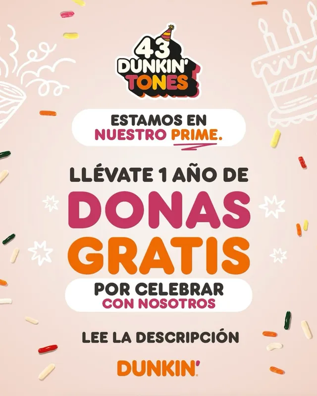 En DUNKIN COLOMBIA celebramos nuestro aniversario 43, y por eso queremos celebrar con nuestros clientes.
