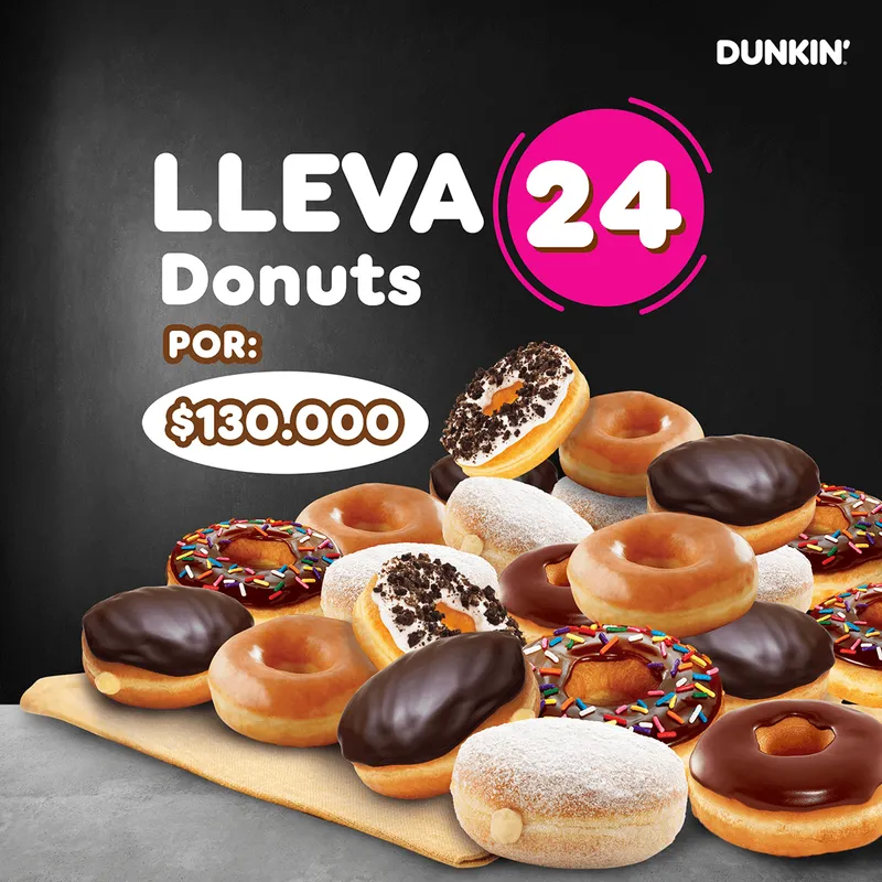 Lleva 24 Donuts por solo $130.000. Aplican condiciones y restricciones: Válida en tiendas de aeropuertos DUNKIN a nivel nacional del 01 de enero al 31 de octubre de 2025. El descuento total es de $38.000 pesos. Donuts premium tendrán un costo adicional de ($1.200). Precios con impuestos incluidos. Mayor información en www.dunkincolombia.com/legales