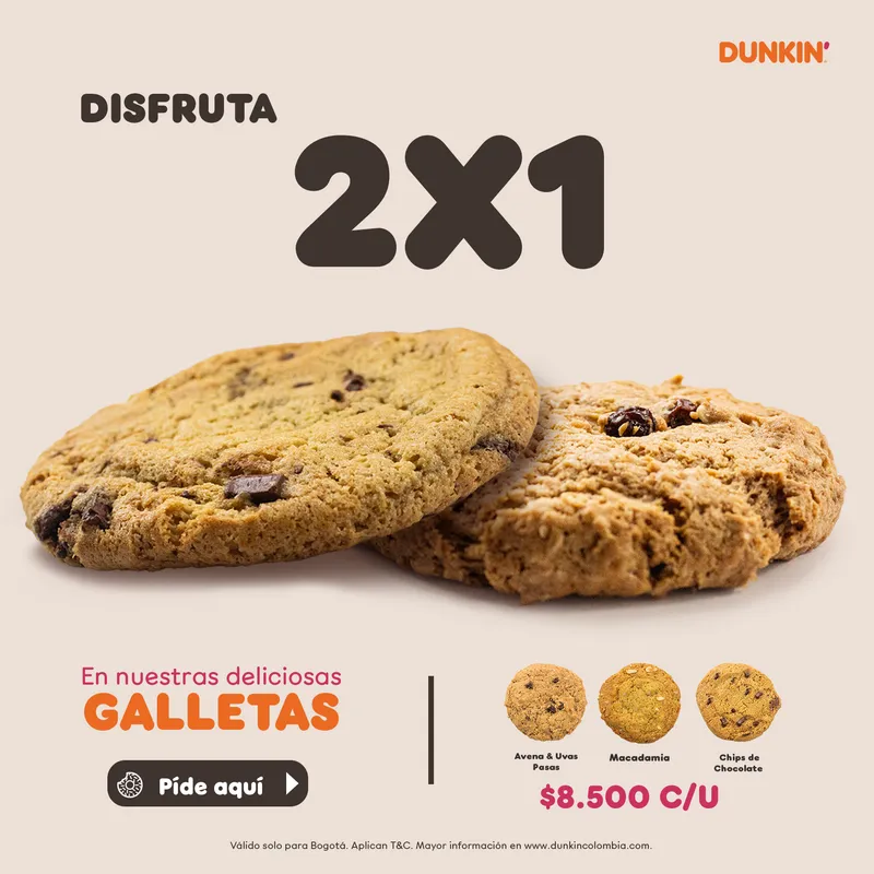 Disfruta nuestra promoción 2x1 en galletas Dunkin’ sabores Avena & Uvas Pasas, Macadamia o Chips de Chocolate. Aplican Condiciones y Restricciones: Válida por tiempo limitado hasta agotar existencias, válido únicamente en Bogotá excepto para terminales aéreos. Los sabores de galleta dependerán de la disponibilidad de cada tienda. Precio de cada galleta $8.500, con impuestos incluidos. Mayor información en www.dunkincolombia.com